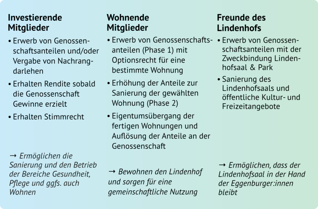 An der Bietergemeinschaft bzw. der zu gründenden Genossenschaft Lindenhof Quartier eGen können sich Investoren in 3 verschiedenen Varianten als Mitunternehmer:innen beteiligen: