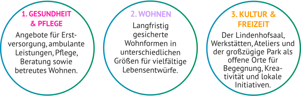 Ob als zukünftige Bewohner:in, Organisation im Gesundheits- oder Sozialbereich oder kreative Zwischennutzer:in – der Lindenhof bietet vielfältige Möglichkeiten in den Bereichen Gesundheit & Pflege, Wohnen und Kultur & Freizeit.